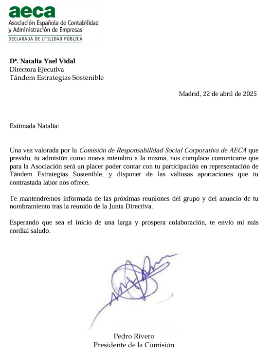 Compartimos un nuevo hito profesional: en nuestra representación, Natalia Yael Vidal -Directora Ejecutiva de Tándem-, se ha incorporado como miembro de la Comisión de Responsabilidad Social Corporativa de AECA (Asociación Española de Contabilidad y Administración...
